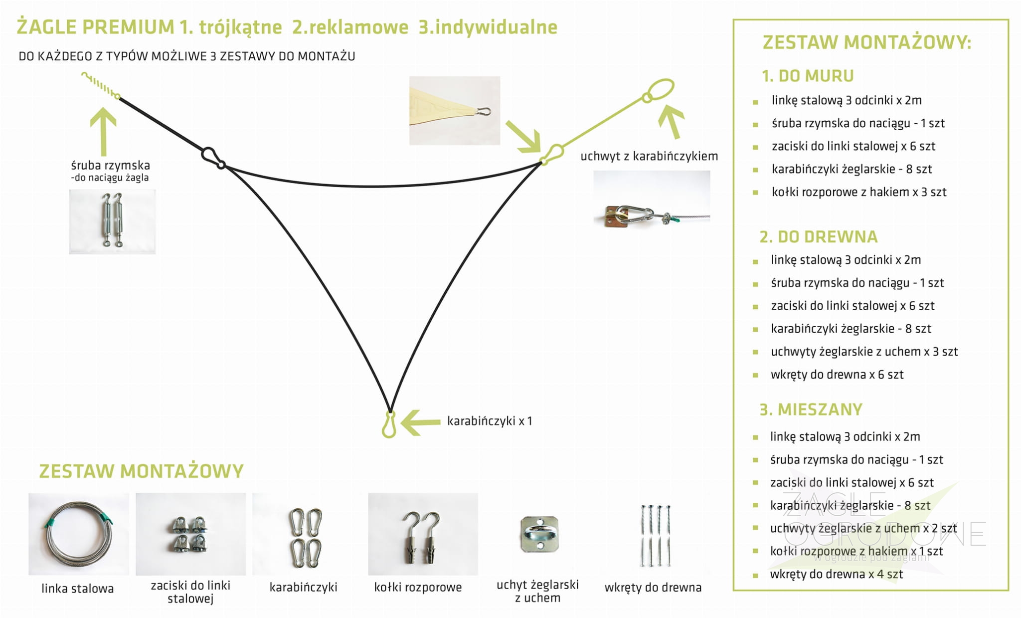 MOUNTING KIT for wood dedicated to sails in the shape of a rectangle and square. Most often used for mounting sails on pergolas, arbors, wooden sofas or wooden poles.