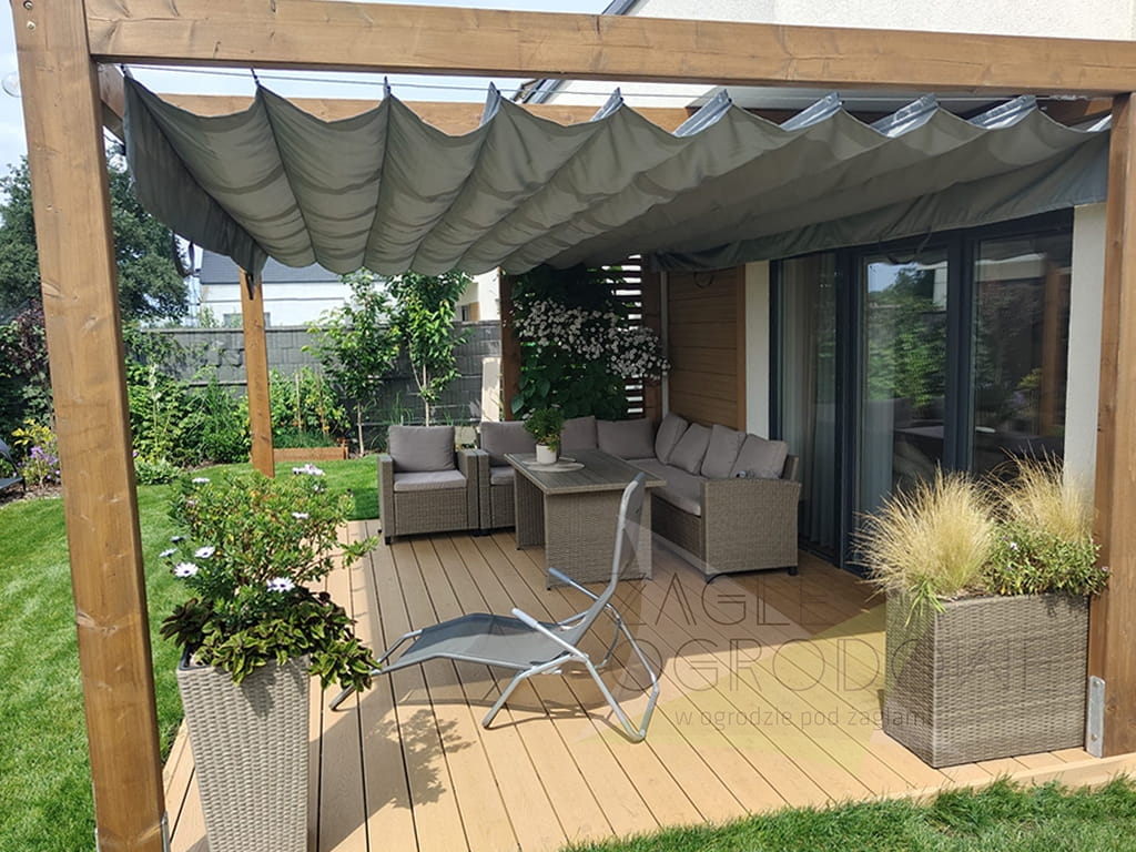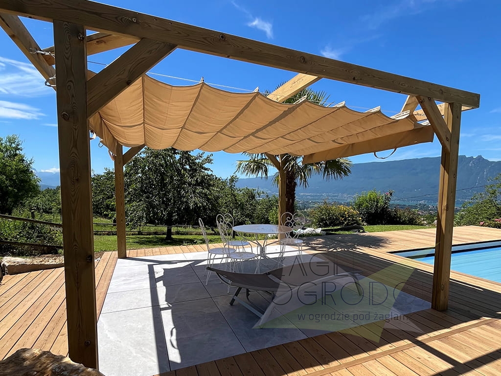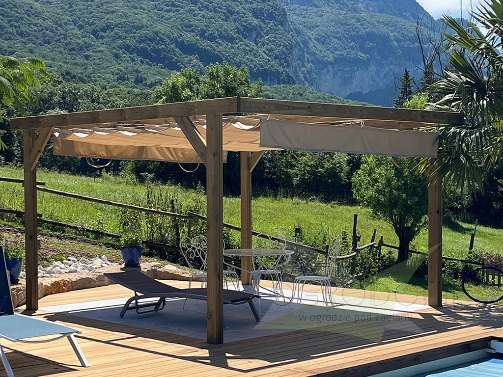 The Horizontal Roman Blind 2,5 × 4 m is a retractable sun shade designed for pergolas, arbours, and balconies. Made from durable 200 g/m² Premium Decor polyester fabric, it offers protection against harmful UV rays and light rain. The blind can be easily extended or retracted depending on weather conditions, while decorative 25 cm ruffles add coverage from the setting sun. Suitable for structures with a span of 340 to 400 cm. Handcrafted in Poland, this shade combines function and elegant design.