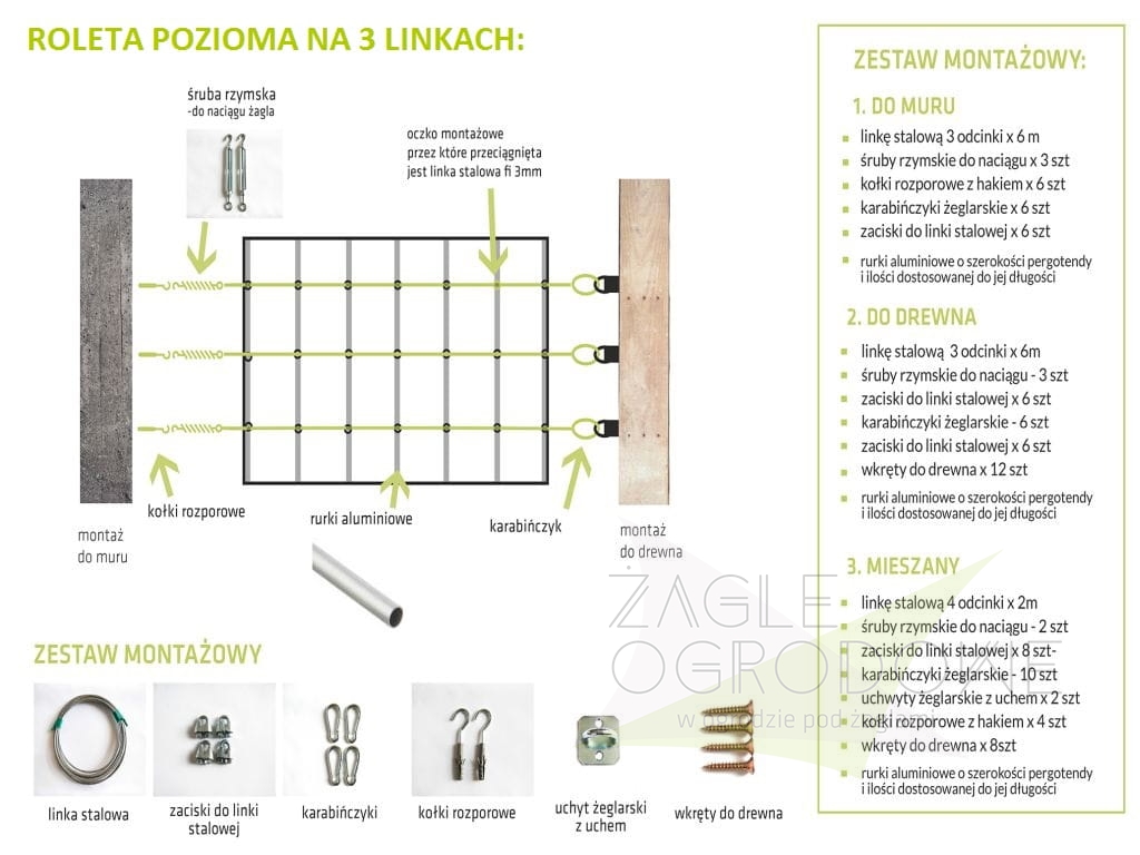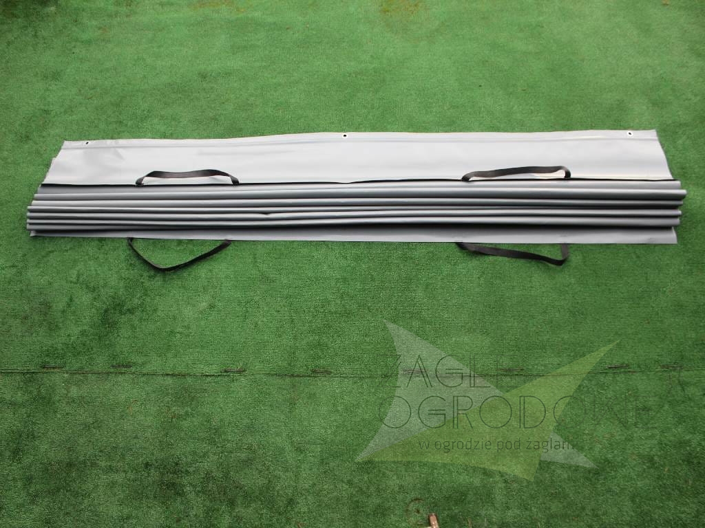 The blind includes horizontal seams approximately every 50 cm, forming channels that hold aluminium stiffening tubes (included in optional mounting kits). These ensure proper tensioning of the fabric and enhance wind resistance. Each blind also features a 25 cm valance for added protection against low-angle sun.